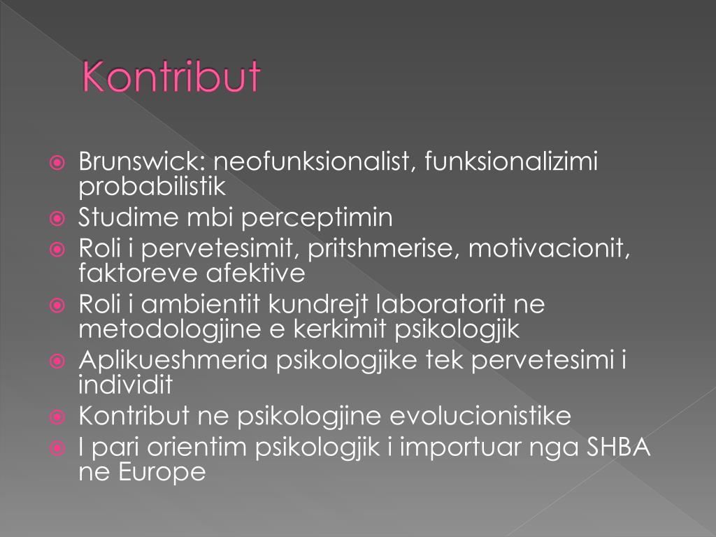 Kontribut • Brunswick: neofunksionalist, funksionalizimi probabilistik • Studime mbi perceptimin • Roli i pervetesimit, pritshmerise, motivacionit, faktoreve afektive • Roli i ambientit kundrejt laboratorit ne metodologjine e kerkimit psikologjik • Aplikueshmeria psikologjike tek pervetesimi i individit • Kontribut ne psikologjine evolucionistike • I pari orientim psikologjik i importuar nga SHBA ne Europe