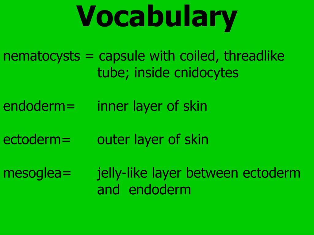 Vocabulary nematocysts = capsule with coiled, threadlike tube; inside cnidocytes endoderm= inner layer of skin ectoderm= outer layer of skin mesoglea= jelly-like layer between ectoderm and endoderm
