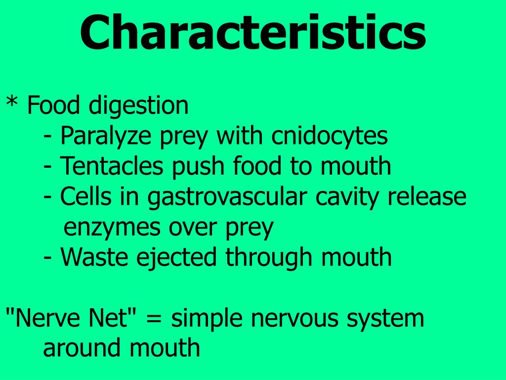 Characteristics * Food digestion - Paralyze prey with cnidocytes - Tentacles push food to mouth - Cells in gastrovascular cavity release enzymes over prey - Waste ejected through mouth "Nerve Net" = simple nervous system around mouth