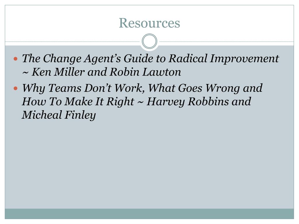 Resources The Change Agent’s Guide to Radical Improvement ~ Ken Miller and Robin Lawton Why Teams Don’t Work, What Goes Wrong and How To Make It Right ~ Harvey Robbins and Micheal Finley