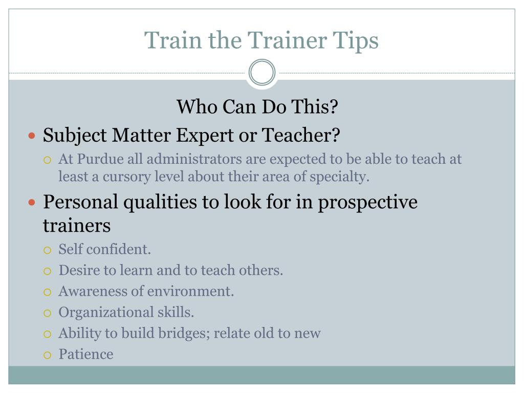 Train the Trainer Tips Who Can Do This? • Subject Matter Expert or Teacher? • At Purdue all administrators are expected to be able to teach at least a cursory level about their area of specialty. • Personal qualities to look for in prospective trainers • Self confident. • Desire to learn and to teach others. • Awareness of environment. • Organizational skills. • Ability to build bridges; relate old to new • Patience