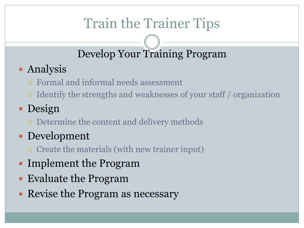 Train the Trainer Tips Develop Your Training Program • Analysis • Formal and informal needs assessment • Identify the strengths and weaknesses of your staff / organization • Design • Determine the content and delivery methods • Development • Create the materials (with new trainer input) • Implement the Program • Evaluate the Program • Revise the Program as necessary