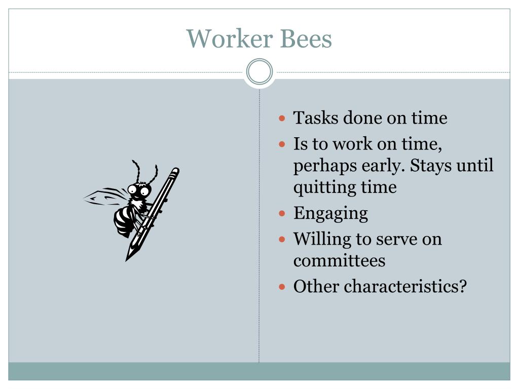 Worker Bees Tasks done on time Is to work on time, perhaps early. Stays until quitting time Engaging Willing to serve on committees Other characteristics?