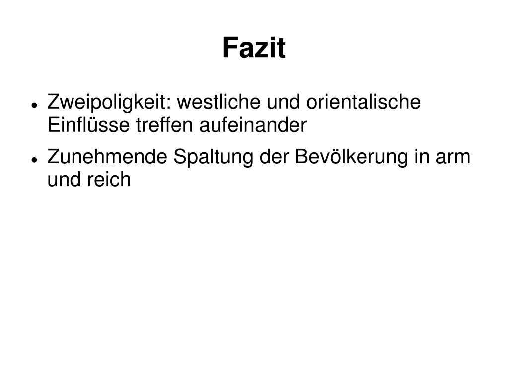 Fazit • Zweipoligkeit: westliche und orientalische Einflüsse treffen aufeinander • Zunehmende Spaltung der Bevölkerung in arm und reich