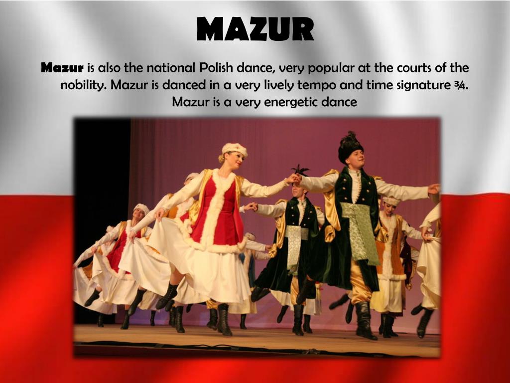 MAZUR Mazur is also the nationalPolishdance, very popular at the courts of the nobility. Mazur is dancedin a very lively tempo and time signature ¾. Mazur is a veryenergeticdance