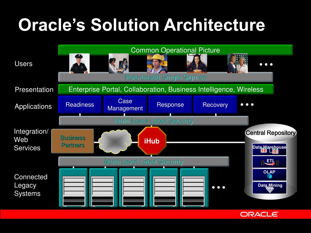 Response Recovery Case Management Multi-Level Label Security Role-based Single Sign-on Multi-Level Label Security Business Partners Readiness iHub Enterprise Portal, Collaboration, Business Intelligence, Wireless Common Operational Picture Central Repository Centralized Data Repository Data Warehouse ETL OLAP Data Mining Oracle’s Solution Architecture … Users Presentation … Applications Integration/ Web Services Connected Legacy Systems …
