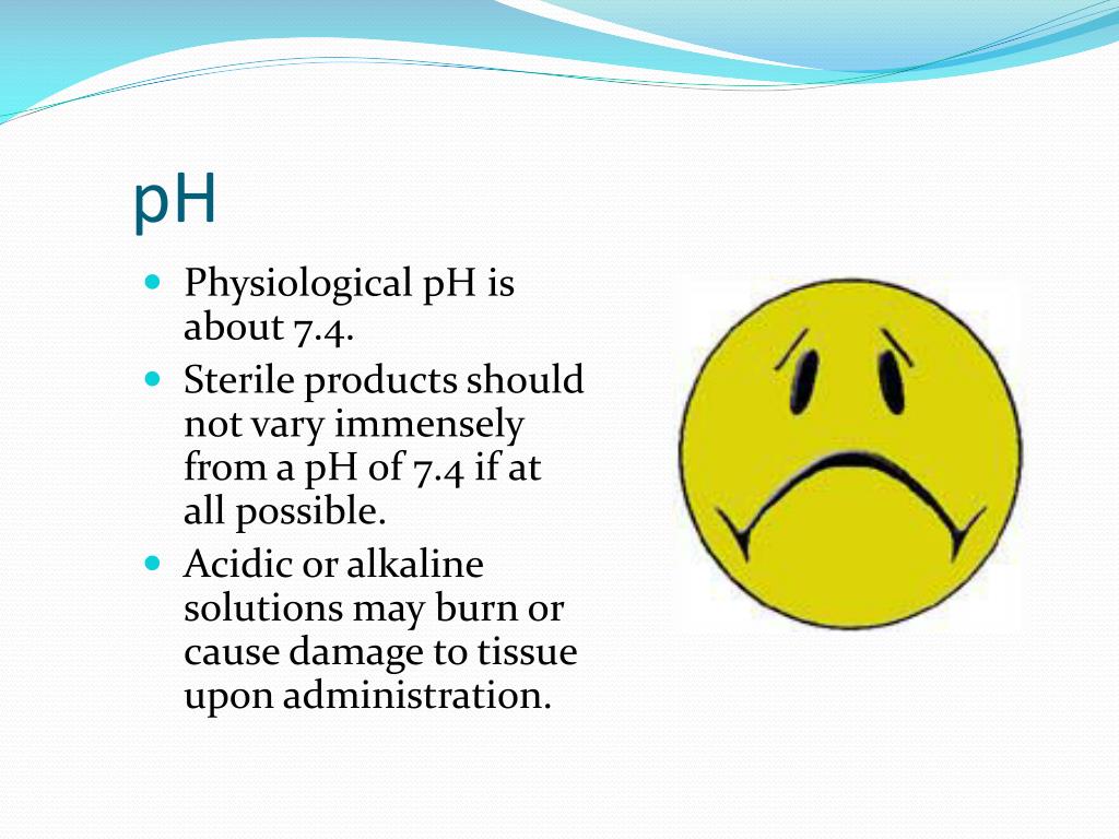 pH • Physiological pH is about 7.4. • Sterile products should not vary immensely from a pH of 7.4 if at all possible. • Acidic or alkaline solutions may burn or cause damage to tissue upon administration.