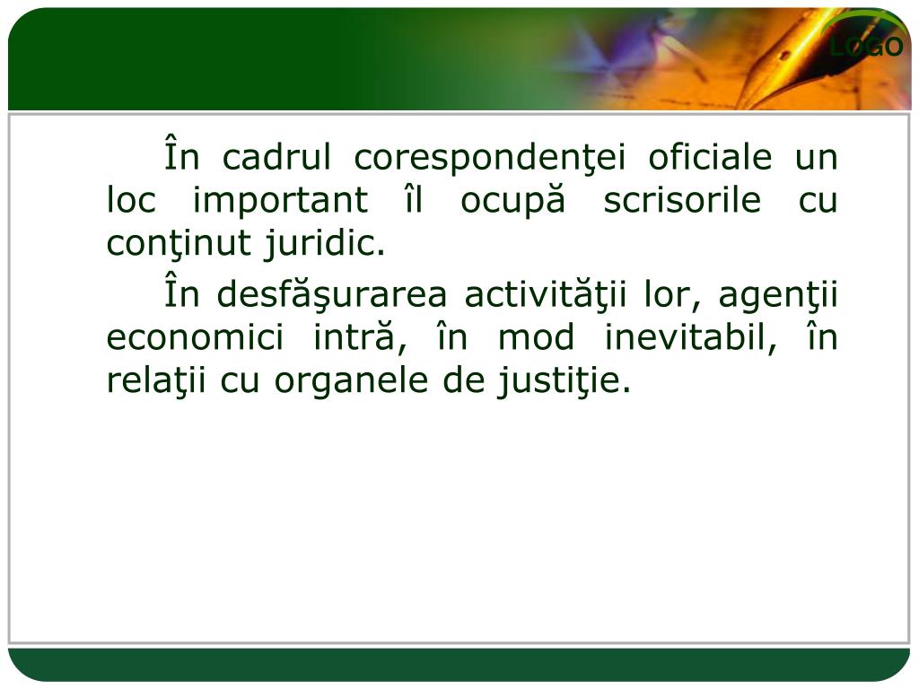 În cadrul corespondenţei oficiale un loc important îl ocupă scrisorile cu conţinut juridic. În desfăşurarea activităţii lor, agenţii economici intră, în mod inevitabil, în relaţii cu organele de justiţie.