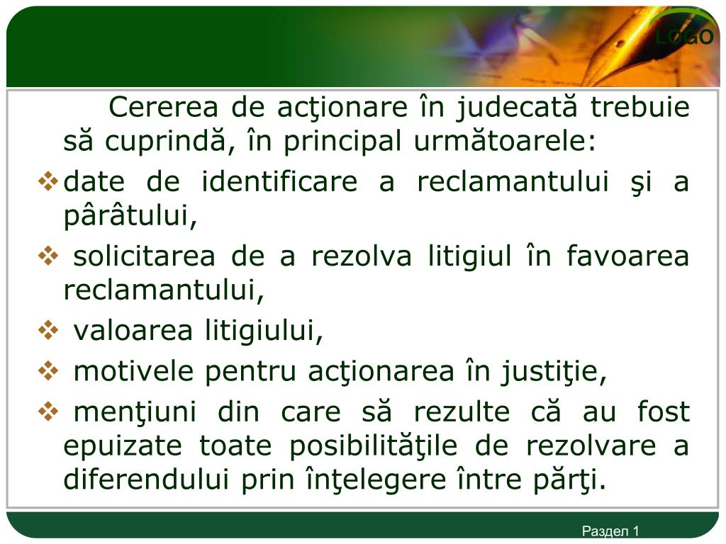Cererea de acţionare în judecată trebuie să cuprindă, în principal următoarele: • date de identificare a reclamantului şi a pârâtului, • solicitarea de a rezolva litigiul în favoarea reclamantului, • valoarea litigiului, • motivele pentru acţionarea în justiţie, • menţiuni din care să rezulte că au fost epuizate toate posibilităţile de rezolvare a diferendului prin înţelegere între părţi. Раздел 1