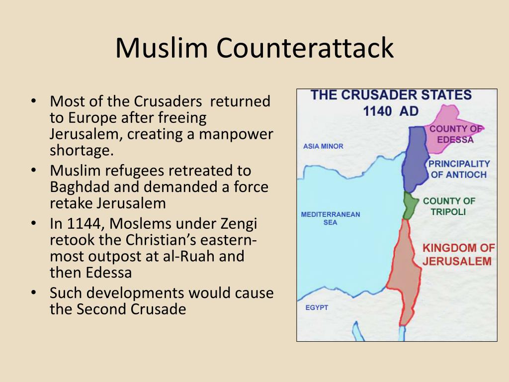 Muslim Counterattack • Most of the Crusaders returned to Europe after freeing Jerusalem, creating a manpower shortage. • Muslim refugees retreated to Baghdad and demanded a force retake Jerusalem • In 1144, Moslems under Zengi retook the Christian’s eastern-most outpost at al-Ruah and then Edessa • Such developments would cause the Second Crusade