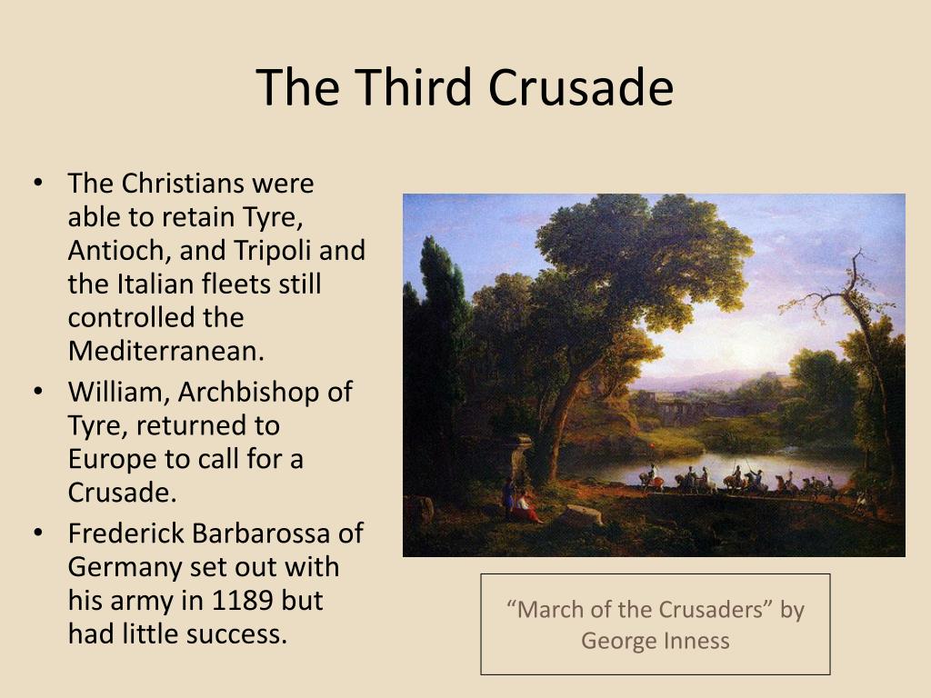 The Third Crusade • The Christians were able to retain Tyre, Antioch, and Tripoli and the Italian fleets still controlled the Mediterranean. • William, Archbishop of Tyre, returned to Europe to call for a Crusade. • Frederick Barbarossa of Germany set out with his army in 1189 but had little success. “March of the Crusaders” by George Inness