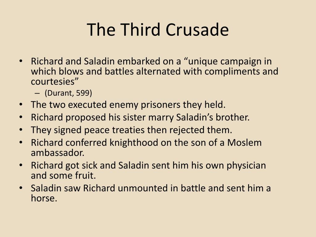 The Third Crusade • Richard and Saladin embarked on a “unique campaign in which blows and battles alternated with compliments and courtesies” • (Durant, 599) • The two executed enemy prisoners they held. • Richard proposed his sister marry Saladin’s brother. • They signed peace treaties then rejected them. • Richard conferred knighthood on the son of a Moslem ambassador. • Richard got sick and Saladin sent him his own physician and some fruit. • Saladin saw Richard unmounted in battle and sent him a horse.