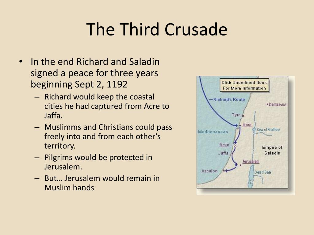 The Third Crusade • In the end Richard and Saladin signed a peace for three years beginning Sept 2, 1192 • Richard would keep the coastal cities he had captured from Acre to Jaffa. • Muslimms and Christians could pass freely into and from each other’s territory. • Pilgrims would be protected in Jerusalem. • But… Jerusalem would remain in Muslim hands
