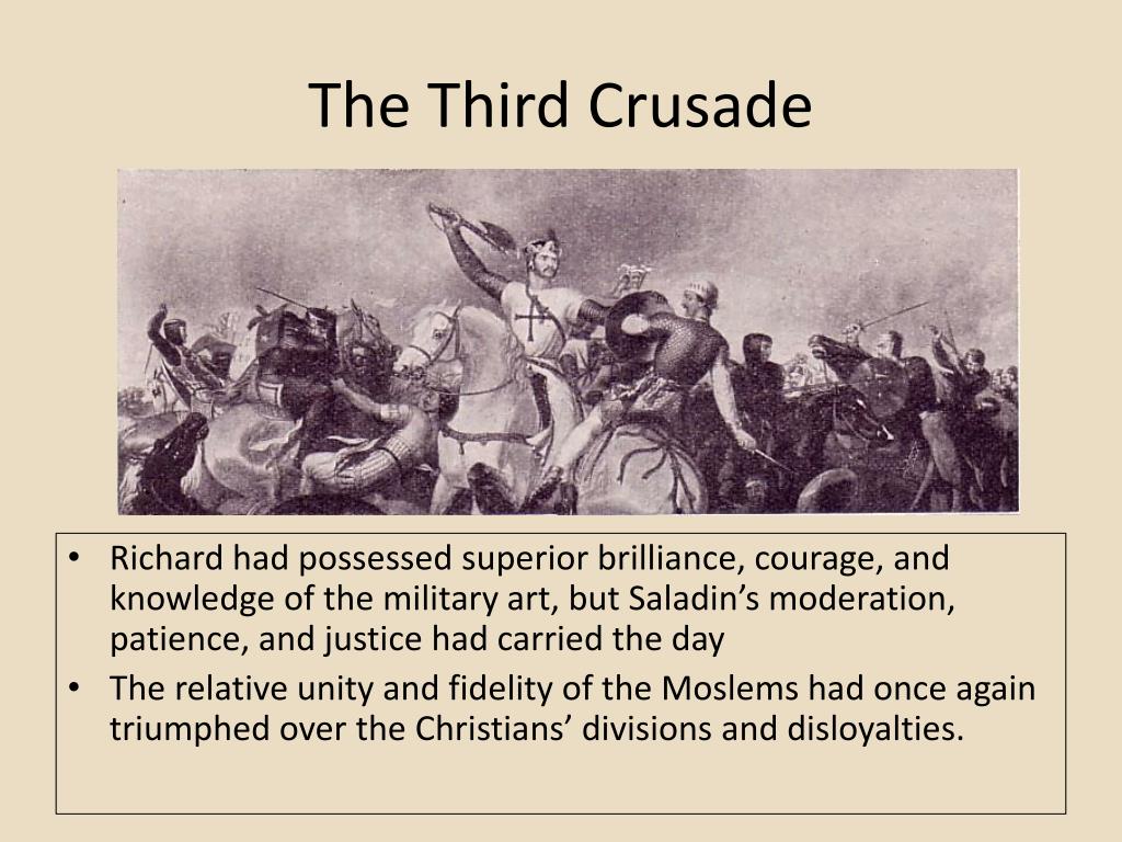 The Third Crusade • Richard had possessed superior brilliance, courage, and knowledge of the military art, but Saladin’s moderation, patience, and justice had carried the day • The relative unity and fidelity of the Moslems had once again triumphed over the Christians’ divisions and disloyalties.