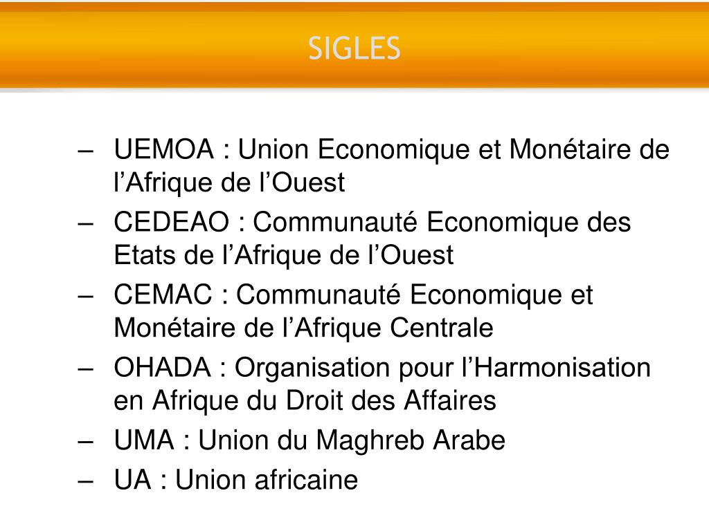 SIGLES • UEMOA : Union Economique et Monétaire de l’Afrique de l’Ouest • CEDEAO : Communauté Economique des Etats de l’Afrique de l’Ouest • CEMAC : Communauté Economique et Monétaire de l’Afrique Centrale • OHADA : Organisation pour l’Harmonisation en Afrique du Droit des Affaires • UMA : Union du Maghreb Arabe • UA : Union africaine
