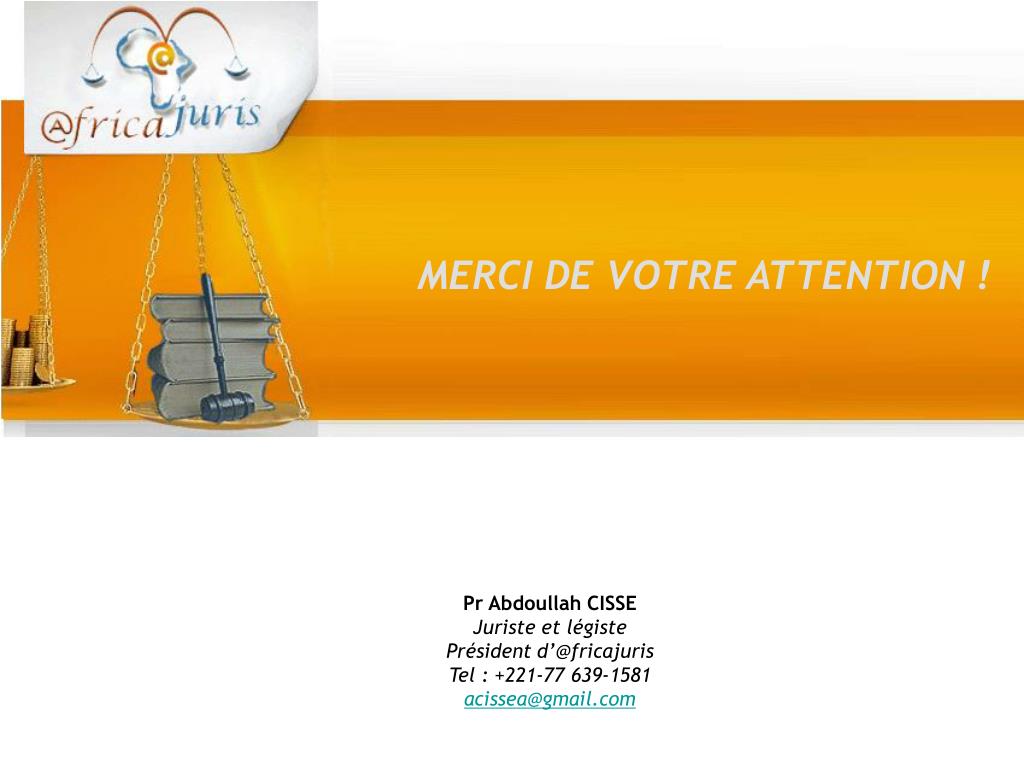 MERCI DE VOTRE ATTENTION ! Pr Abdoullah CISSE Juriste et légiste Président d’@fricajuris Tel : +221-77 639-1581 acissea@gmail.com