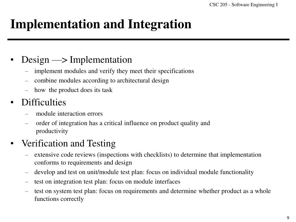 Implementation and Integration • Design —> Implementation • implement modules and verify they meet their specifications • combine modules according to architectural design • how the product does its task • Difficulties • module interaction errors • order of integration has a critical influence on product quality and productivity • Verification and Testing • extensive code reviews (inspections with checklists) to determine that implementation conforms to requirements and design • develop and test on unit/module test plan: focus on individual module functionality • test on integration test plan: focus on module interfaces • test on system test plan: focus on requirements and determine whether product as a whole functions correctly