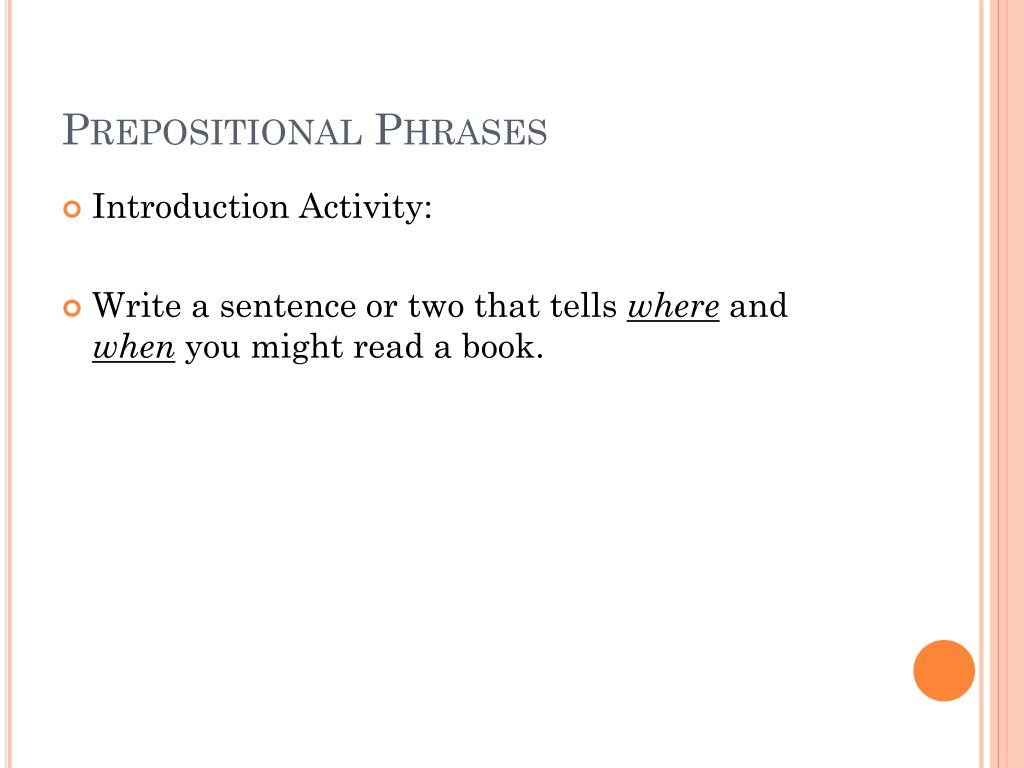 Prepositional Phrases. Prepositional Phrases . Introduction Activity: Write a sentence or two that tells where and when you might read a book. Prepositional Phrases . Now let’s talk about prepositional phrases!