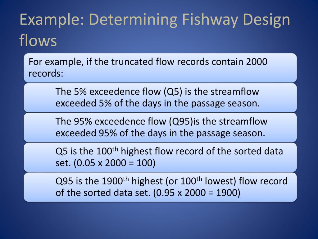Example: Using 5% and 95% exceedence flow range in fish passage design • Suppose assessment using previously demonstrated method yields: Q5 = 11,250 cfs and Q95 = 210 cfs. • Using a tailwater rating curve, the water surface elevations for an bypass outfall location can be determined.