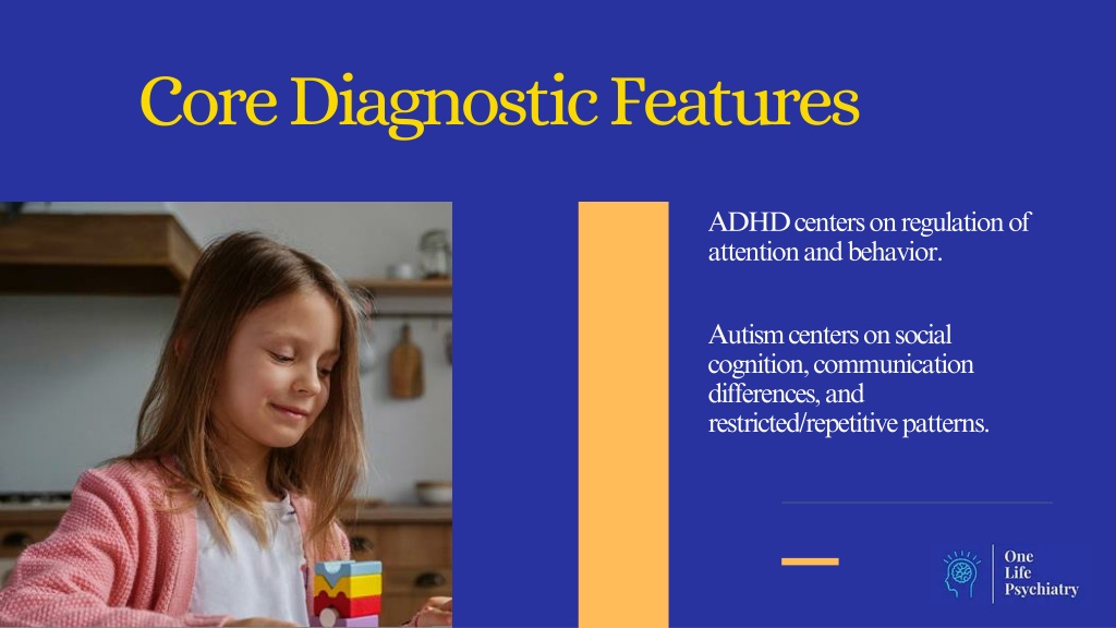Core Diagnostic Features ADHD centers on regulation of attention and behavior. Autism centers on social cognition, communication differences, and restricted/repetitive patterns.