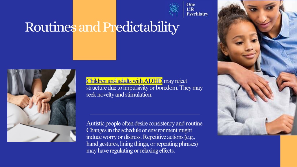 Routines and Predictability Children and adults with ADHDmay reject structure due to impulsivity or boredom. They may seek novelty and stimulation. Autistic people often desire consistency and routine. Changes in the schedule or environment might induce worry or distress. Repetitive actions (e.g., hand gestures, lining things, or repeating phrases) may have regulating or relaxing effects.