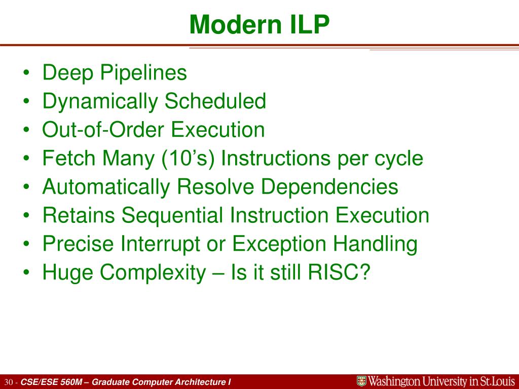 Modern ILP • Deep Pipelines • Dynamically Scheduled • Out-of-Order Execution • Fetch Many (10’s) Instructions per cycle • Automatically Resolve Dependencies • Retains Sequential Instruction Execution • Precise Interrupt or Exception Handling • Huge Complexity – Is it still RISC?