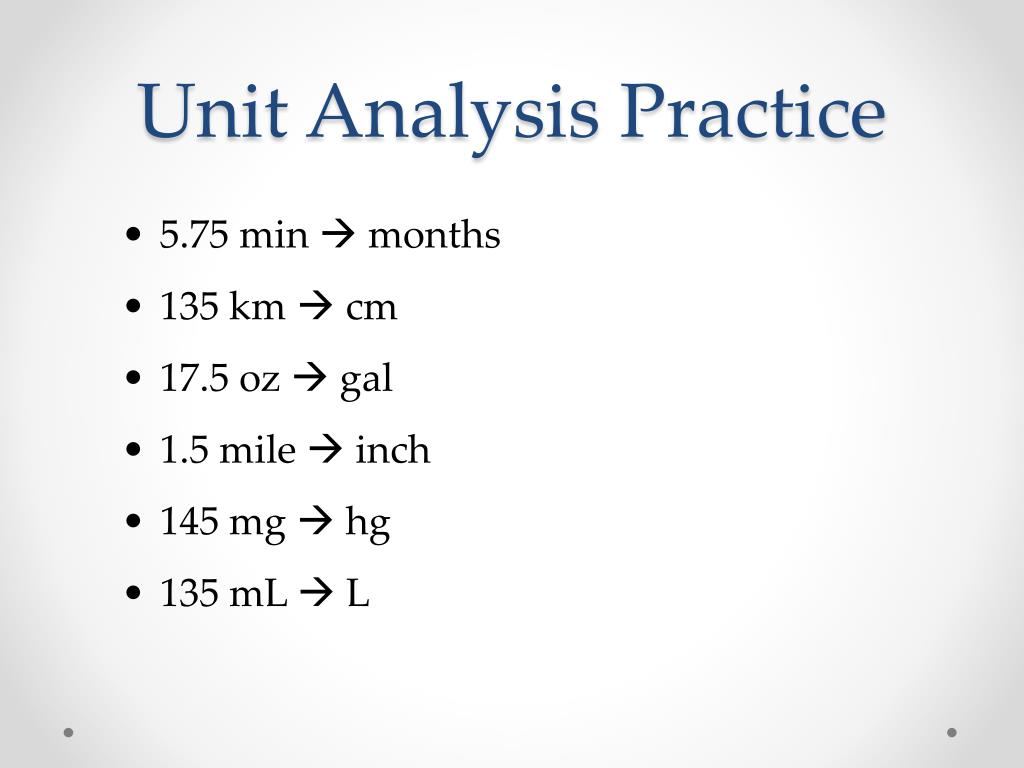 Unit Analysis Practice • 5.75 min months • 135 km cm • 17.5 oz gal • 1.5 mile inch • 145 mg hg • 135 mL L