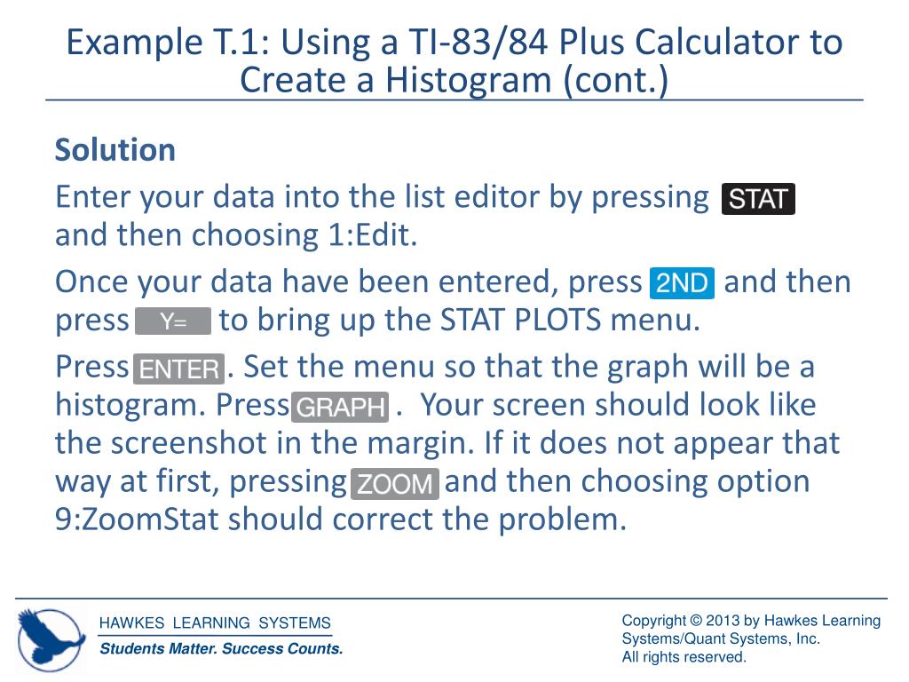 Example T.1: Using a TI-83/84 Plus Calculator to Create a Histogram (cont.) Solution Enter your data into the list editor by pressing and then choosing 1:Edit. Once your data have been entered, press and then press to bring up the STAT PLOTS menu. Press . Set the menu so that the graph will be a histogram. Press . Your screen should look like the screenshot in the margin. If it does not appear that way at first, pressing and then choosing option 9:ZoomStat should correct the problem.