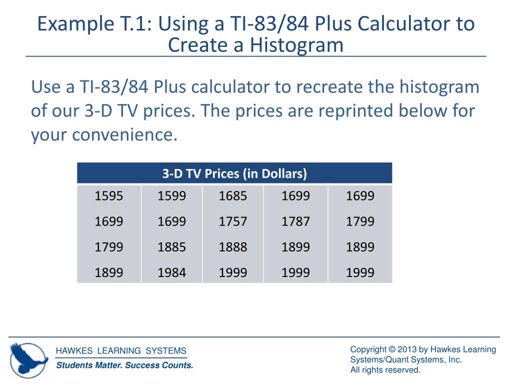 Example T.1: Using a TI-83/84 Plus Calculator to Create a Histogram Use a TI‑83/84 Plus calculator to recreate the histogram of our 3-D TV prices. The prices are reprinted below for your convenience.