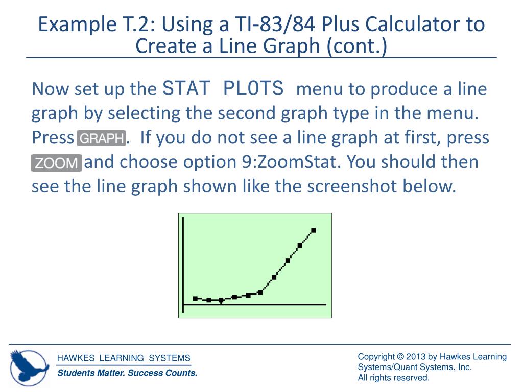 Example T.2: Using a TI-83/84 Plus Calculator to Create a Line Graph (cont.) Now set up the STAT PLOTS menu to produce a line graph by selecting the second graph type in the menu. Press . If you do not see a line graph at first, press and choose option 9:ZoomStat. You should then see the line graph shown like the screenshot below.
