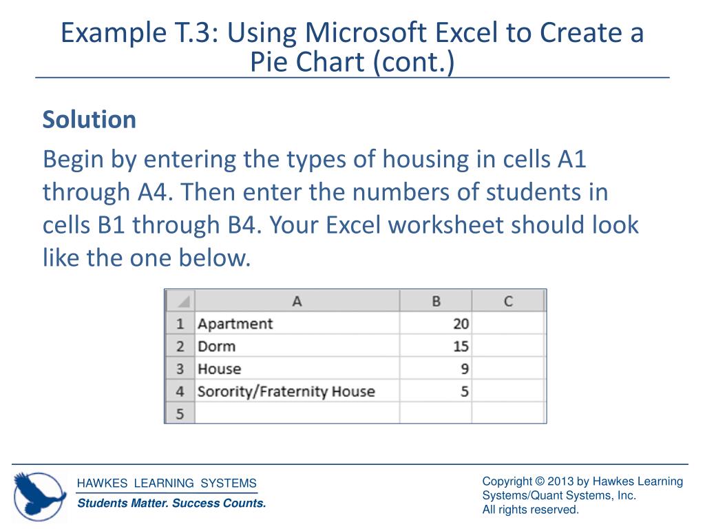 Example T.3: Using Microsoft Excel to Create a Pie Chart (cont.) Solution Begin by entering the types of housing in cells A1 through A4. Then enter the numbers of students in cells B1 through B4. Your Excel worksheet should look like the one below.