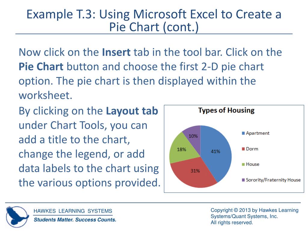 Example T.3: Using Microsoft Excel to Create a Pie Chart (cont.) Now click on the Insert tab in the tool bar. Click on the Pie Chart button and choose the first 2-D pie chart option. The pie chart is then displayed within the worksheet. By clicking on the Layout tab under Chart Tools, you can add a title to the chart, change the legend, or add data labels to the chart using the various options provided.