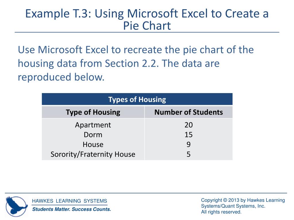 Example T.3: Using Microsoft Excel to Create a Pie Chart Use Microsoft Excel to recreate the pie chart of the housing data from Section 2.2. The data are reproduced below.