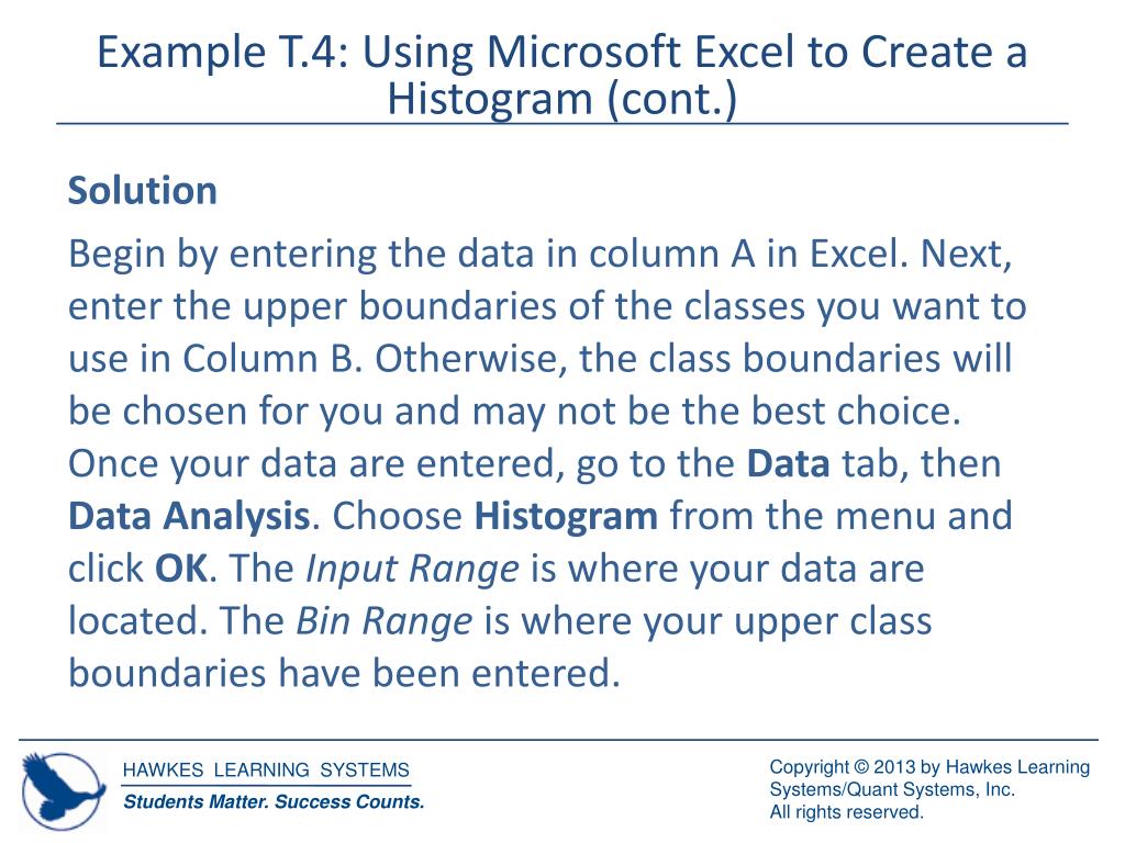 Example T.4: Using Microsoft Excel to Create a Histogram (cont.) Solution Begin by entering the data in column A in Excel. Next, enter the upper boundaries of the classes you want to use in Column B. Otherwise, the class boundaries will be chosen for you and may not be the best choice. Once your data are entered, go to the Data tab, then Data Analysis. Choose Histogram from the menu and click OK. The Input Range is where your data are located. The Bin Range is where your upper class boundaries have been entered.