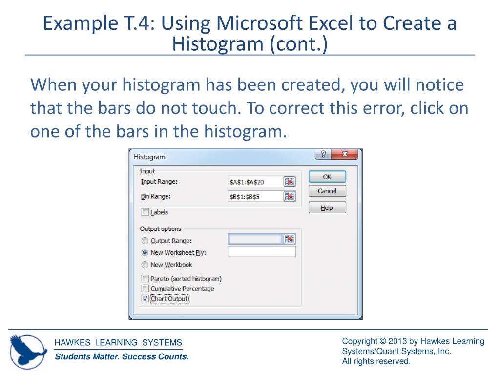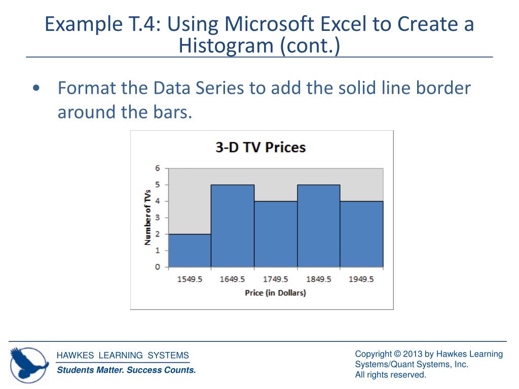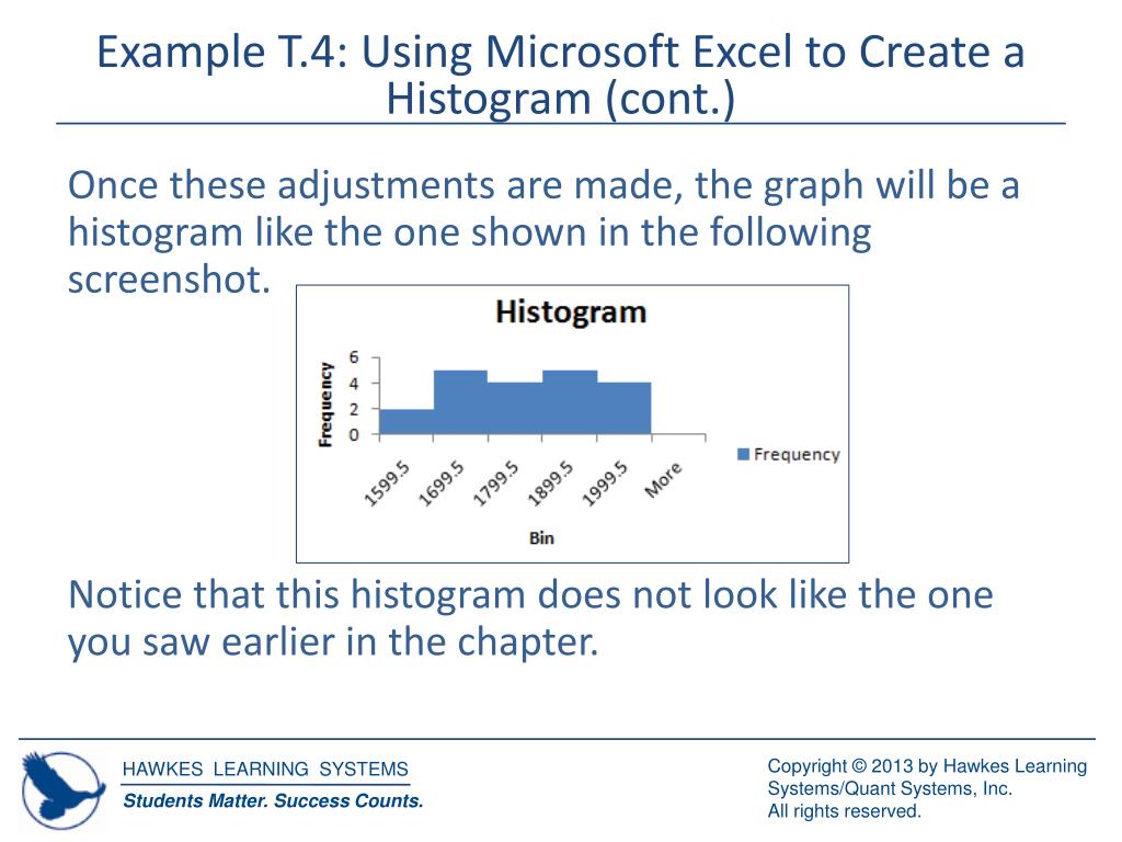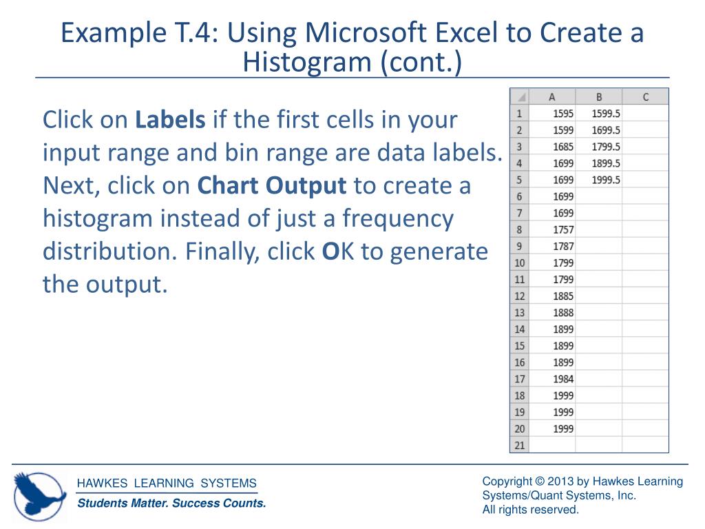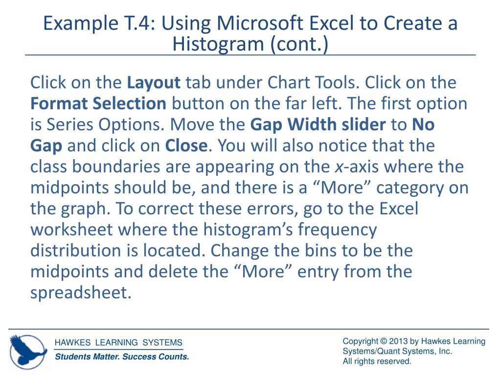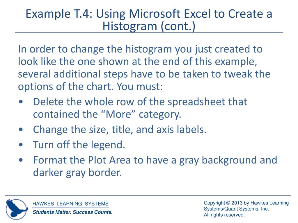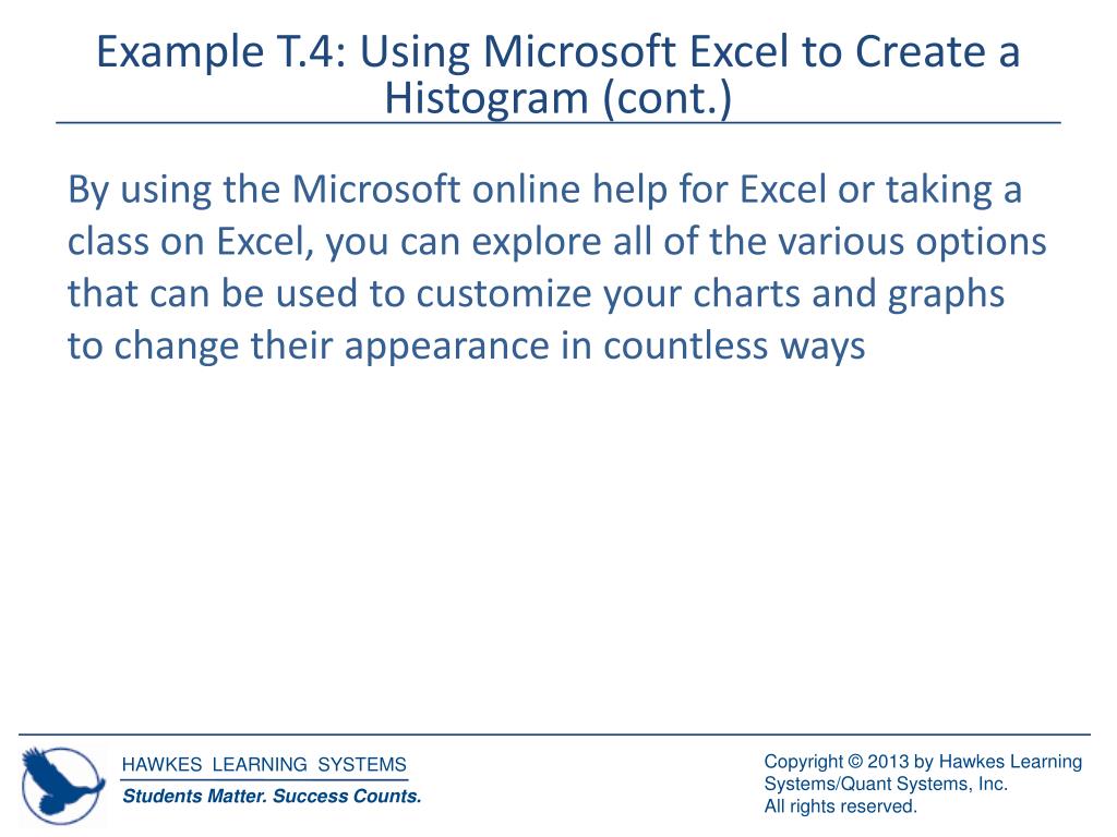 Example T.4: Using Microsoft Excel to Create a Histogram (cont.) By using the Microsoft online help for Excel or taking a class on Excel, you can explore all of the various options that can be used to customize your charts and graphs to change their appearance in countless ways