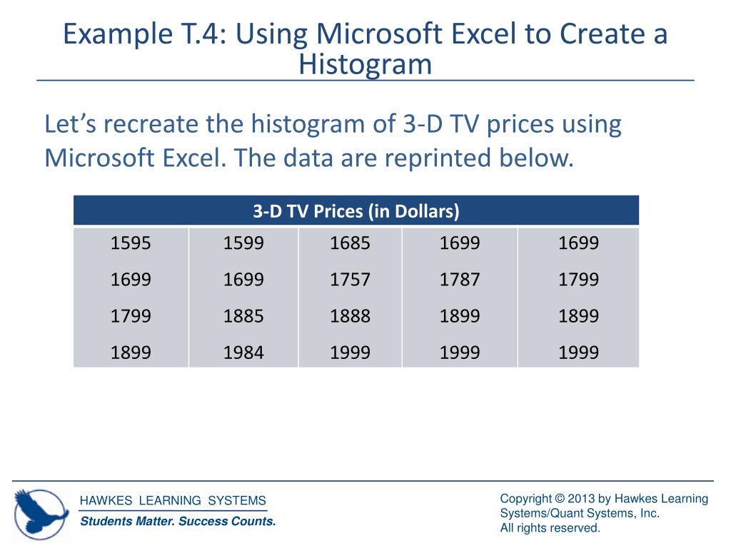 Example T.4: Using Microsoft Excel to Create a Histogram Let’s recreate the histogram of 3-D TV prices using Microsoft Excel. The data are reprinted below.