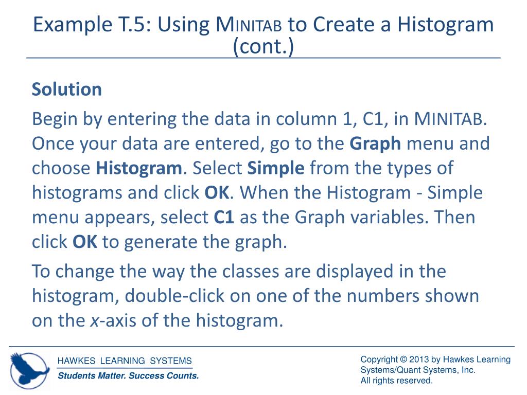 Example T.5: Using Minitab to Create a Histogram (cont.) Solution Begin by entering the data in column 1, C1, in MINITAB. Once your data are entered, go to the Graph menu and choose Histogram. Select Simple from the types of histograms and click OK. When the Histogram - Simple menu appears, select C1 as the Graph variables. Then click OK to generate the graph. To change the way the classes are displayed in the histogram, double-click on one of the numbers shown on the x-axis of the histogram.