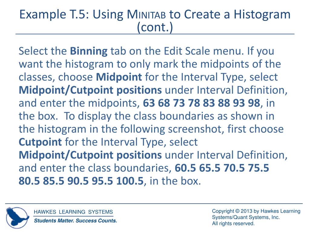 Example T.5: Using Minitab to Create a Histogram (cont.) Select the Binning tab on the Edit Scale menu. If you want the histogram to only mark the midpoints of the classes, choose Midpoint for the Interval Type, select Midpoint/Cutpoint positions under Interval Definition, and enter the midpoints, 63 68 73 78 83 88 93 98, in the box. To display the class boundaries as shown in the histogram in the following screenshot, first choose Cutpoint for the Interval Type, select Midpoint/Cutpoint positions under Interval Definition, and enter the class boundaries, 60.5 65.5 70.5 75.5 80.5 85.5 90.5 95.5 100.5, in the box.