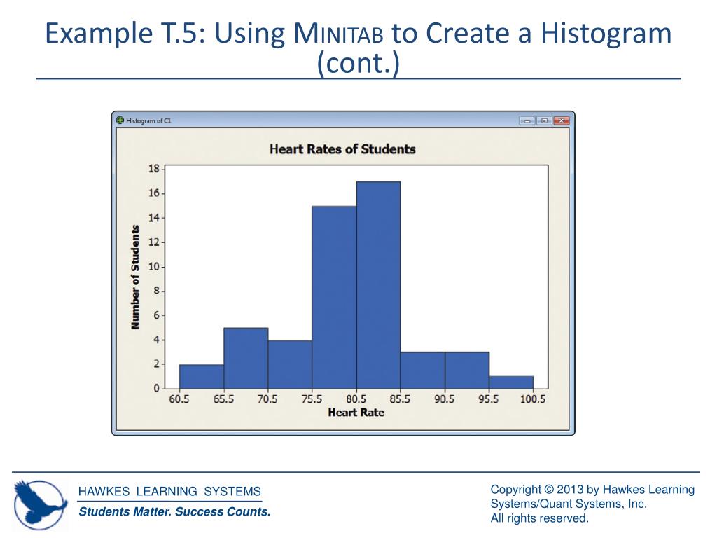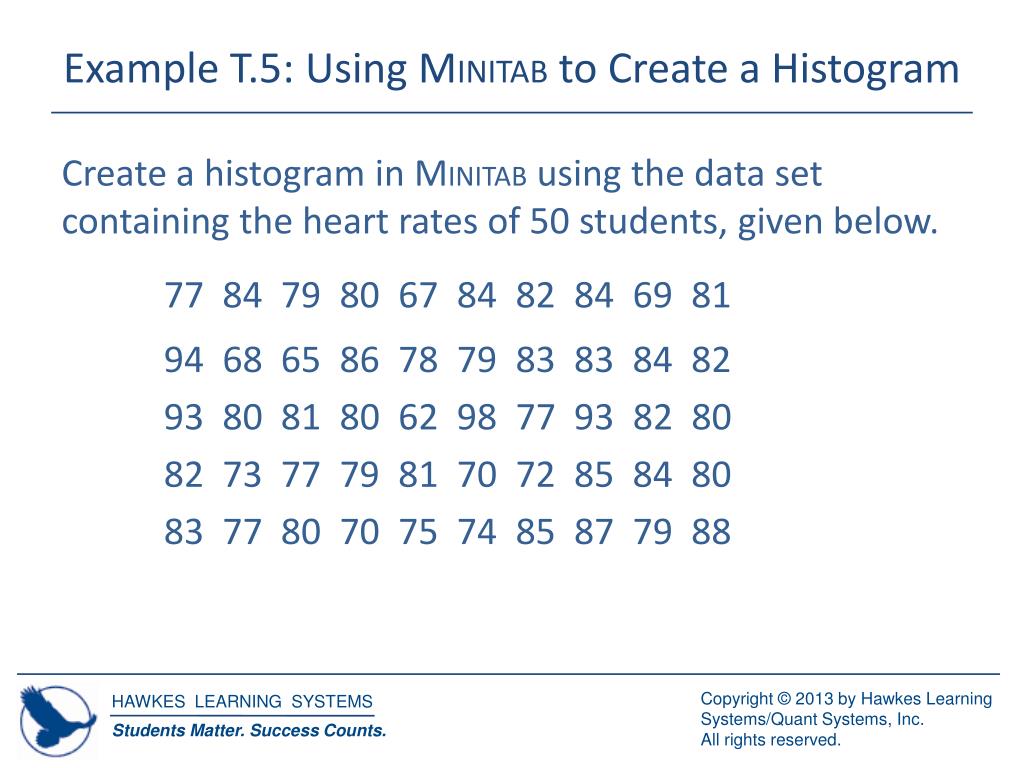 Example T.5: Using Minitab to Create a Histogram Create a histogram in Minitab using the data set containing the heart rates of 50 students, given below. 77 84 79 80 67 84 82 84 69 81 94 68 65 86 78 79 83 83 84 82 93 80 81 80 62 98 77 93 82 80 82 73 77 79 81 70 72 85 84 80 83 77 80 70 75 74 85 87 79 88