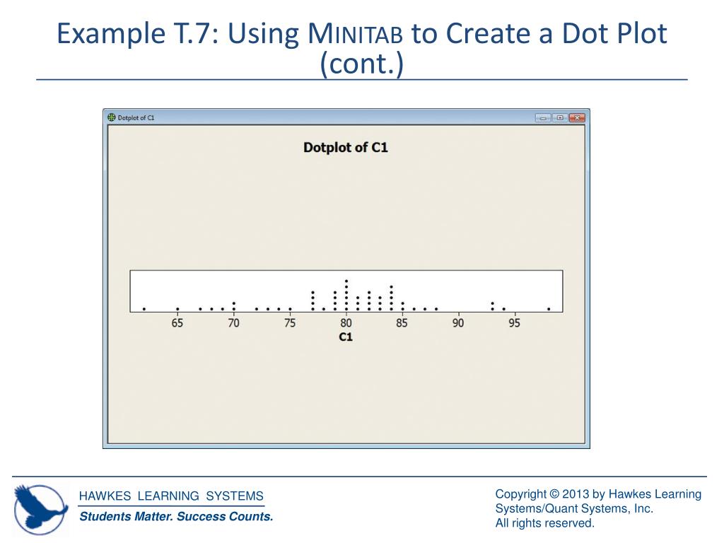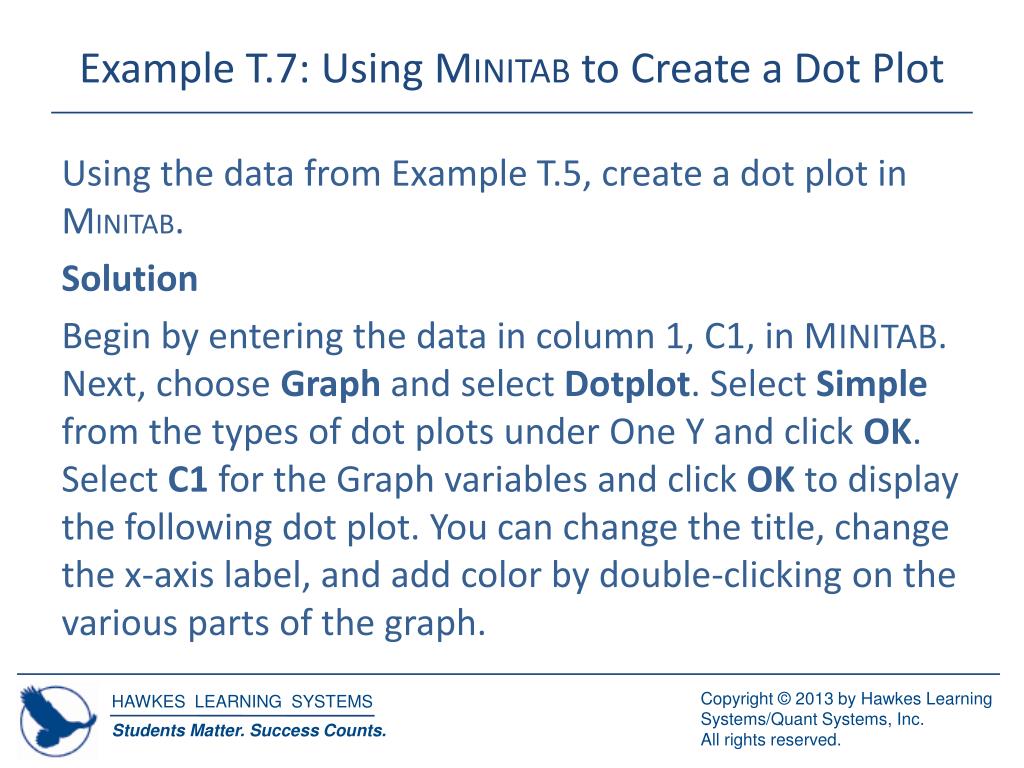 Example T.7: Using Minitab to Create a Dot Plot Using the data from Example T.5, create a dot plot in Minitab. Solution Begin by entering the data in column 1, C1, in MINITAB. Next, choose Graph and select Dotplot. Select Simple from the types of dot plots under One Y and click OK. Select C1 for the Graph variables and click OK to display the following dot plot. You can change the title, change the x-axis label, and add color by double-clicking on the various parts of the graph.