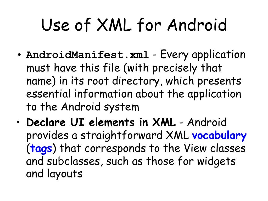 Use of XML for Android • AndroidManifest.xml- Every application must have this file (with precisely that name) in its root directory, which presents essential information about the application to the Android system • Declare UI elements in XML- Android provides a straightforward XML vocabulary (tags) that corresponds to the View classes and subclasses, such as those for widgets and layouts