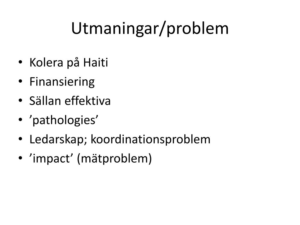 Utmaningar/problem • Kolera på Haiti • Finansiering • Sällan effektiva • ’pathologies’ • Ledarskap; koordinationsproblem • ’impact’ (mätproblem)