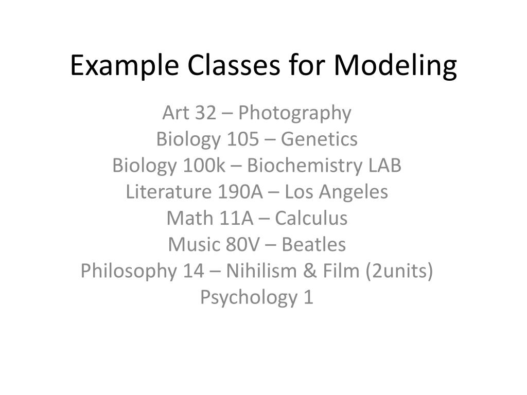 Example Classes for Modeling Art 32 – Photography Biology 105 – Genetics Biology 100k – Biochemistry LAB Literature 190A – Los Angeles Math 11A – Calculus Music 80V – Beatles Philosophy 14 – Nihilism & Film (2units) Psychology 1
