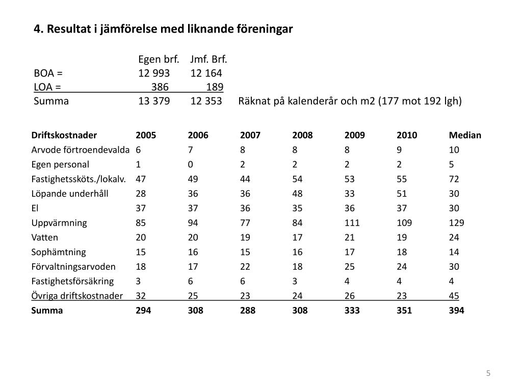4. Resultat i jämförelse med liknande föreningar Egen brf. Jmf. Brf.BOA = 12 993 12 164LOA = 386 189Summa 13 379 12 353 Räknat på kalenderår och m2 (177 mot 192 lgh) Driftskostnader 2005 2006 2007 2008 2009 2010 Median Arvode förtroendevalda 6 7 8 8 8 9 10 Egen personal 1 0 2 2 22 5 Fastighetssköts./lokalv. 47 49 44 54 53 55 72 Löpande underhåll 28 36 36 48 33 51 30 El 37 37 36 35 36 37 30 Uppvärmning 85 94 77 84 111 109 129 Vatten 20 20 19 17 21 19 24 Sophämtning 15 16 15 16 17 18 14 Förvaltningsarvoden 18 17 22 18 25 24 30 Fastighetsförsäkring 3 6 6 3 4 44 Övriga driftskostnader 32 25 23 24 26 23 45 Summa 294 308 288 308 333 351 394