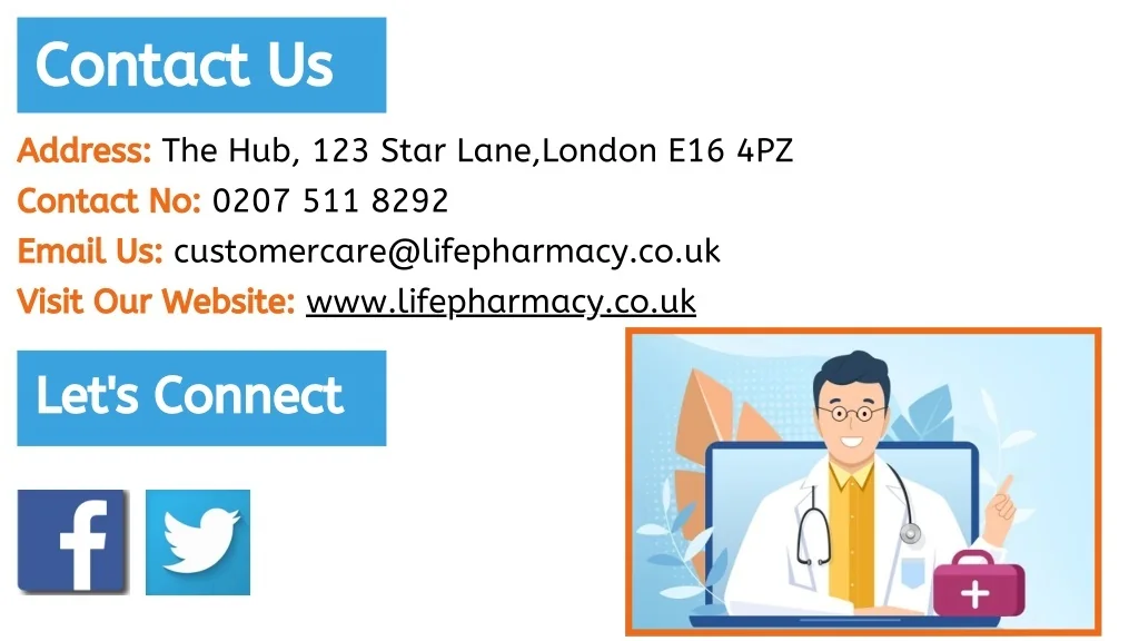 Contact Us Address: The Hub, 123 Star Lane,London E16 4PZ Contact No: 0207 511 8292 Email Us: customercare@lifepharmacy.co.uk Visit Our Website: www.lifepharmacy.co.uk Let's Connect