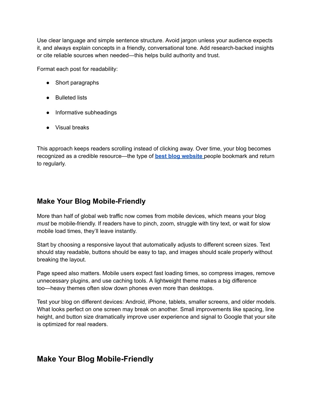 3. Use clear language and simple sentence structure. Avoid jargon unless your audience expects it, and always explain concepts in a friendly, conversational tone. Add research-backed insights or cite reliable sources when needed—this helps build authority and trust. Format each post for readability: ● Short paragraphs ● Bulleted lists ● Informative subheadings ● Visual breaks This approach keeps readers scrolling instead of clicking away. Over time, your blog becomes recognized as a credible resource—the type of best blog websitepeople bookmark and return to regularly. Make Your Blog Mobile-Friendly More than half of global web traffic now comes from mobile devices, which means your blog must be mobile-friendly. If readers have to pinch, zoom, struggle with tiny text, or wait for slow mobile load times, they’ll leave instantly. Start by choosing a responsive layout that automatically adjusts to different screen sizes. Text should stay readable, buttons should be easy to tap, and images should scale properly without breaking the layout. Page speed also matters. Mobile users expect fast loading times, so compress images, remove unnecessary plugins, and use caching tools. A lightweight theme makes a big difference too—heavy themes often slow down phones even more than desktops. Test your blog on different devices: Android, iPhone, tablets, smaller screens, and older models. What looks perfect on one screen may break on another. Small improvements like spacing, line height, and button size dramatically improve user experience and signal to Google that your site is optimized for real readers. Make Your Blog Mobile-Friendly