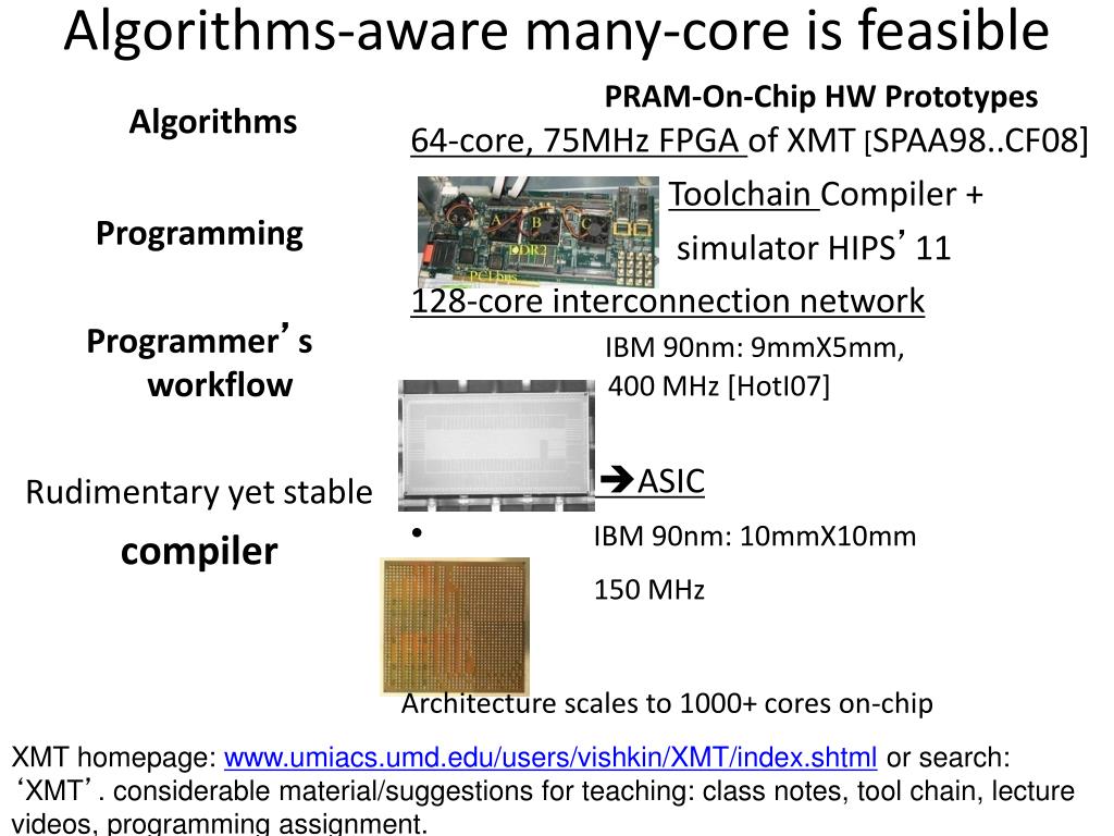 Algorithms-aware many-core is feasible Algorithms PRAM-On-Chip HW Prototypes 64-core, 75MHz FPGA of XMT [SPAA98..CF08 ] Toolchain Compiler + simulator HIPS’11 128-core interconnection networkIBM 90nm: 9mmX5mm, - 400 MHz [HotI07] FPGA designASIC IBM 90nm: 10mmX10mm 150 MHz Programming Programmer’s workflow Rudimentary yet stable compiler Architecture scales to 1000+ cores on-chip XMT homepage: www.umiacs.umd.edu/users/vishkin/XMT/index.shtml or search: ‘XMT’. considerable material/suggestions for teaching: class notes, tool chain, lecture videos, programming assignment.