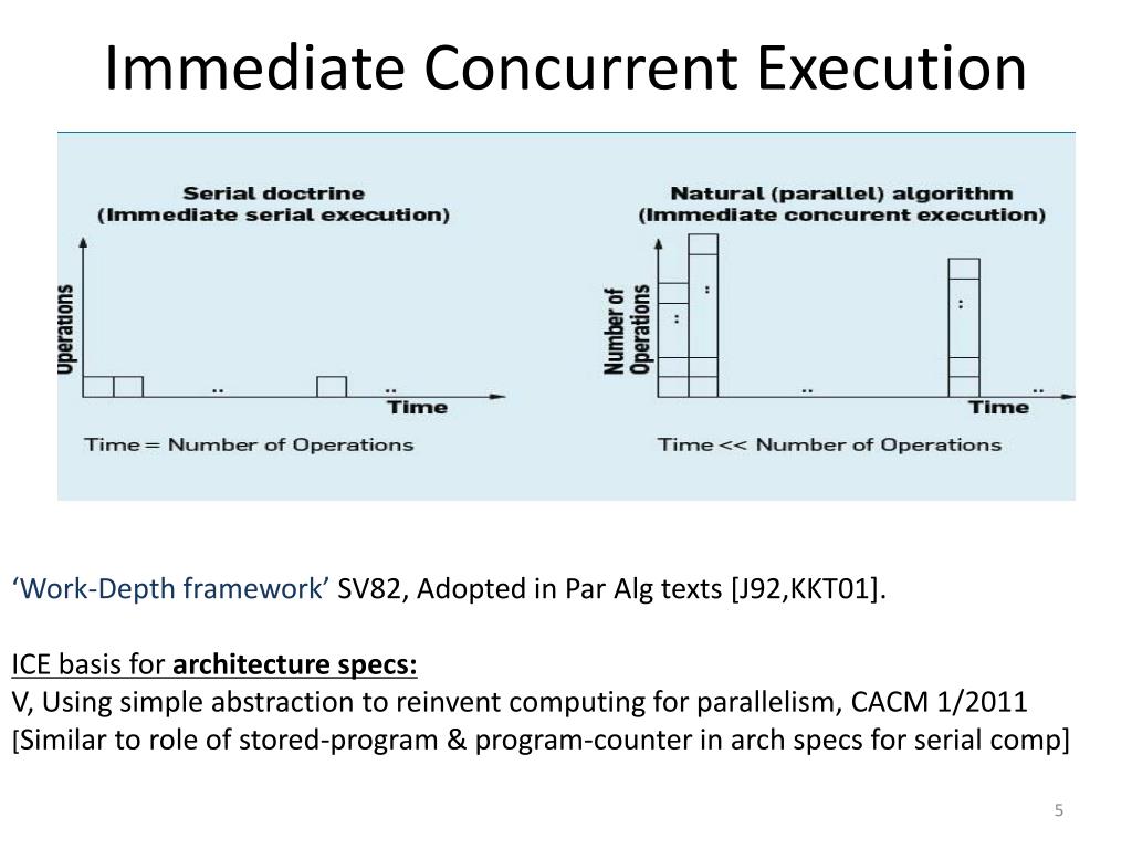 Immediate Concurrent Execution ‘Work-Depth framework’SV82, Adopted in Par Alg texts [J92,KKT01]. ICE basis for architecture specs: V, Using simple abstraction to reinvent computing for parallelism, CACM 1/2011 [Similar to role of stored-program & program-counter in arch specs for serial comp]