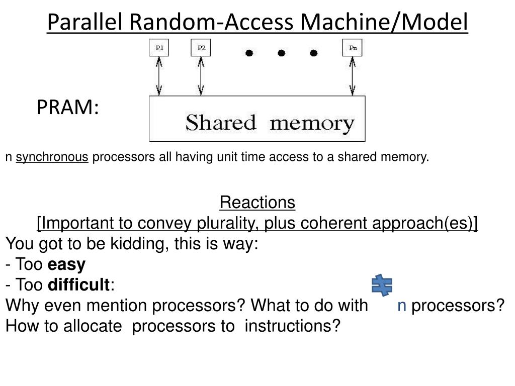 Parallel Random-Access Machine/Model PRAM: n synchronous processors all having unit time access to a shared memory. • Reactions • [Important to convey plurality, plus coherent approach(es)] • You got to be kidding, this is way: • - Too easy • Too difficult: • Why even mention processors? What to do with n processors? How to allocate processors to instructions?
