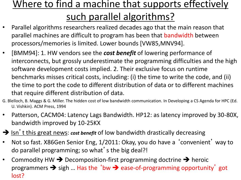 Where to find a machine that supports effectively such parallel algorithms? • Parallel algorithms researchers realized decades ago that the main reason that parallel machines are difficult to program has been that bandwidth between processors/memories is limited. Lower bounds [VW85,MNV94]. • [BMM94]: 1. HW vendors see the cost benefit of lowering performance of interconnects, but grossly underestimate the programming difficulties and the high software development costs implied. 2. Their exclusive focus on runtime benchmarks misses critical costs, including: (i) the time to write the code, and (ii) the time to port the code to different distribution of data or to different machines that require different distribution of data. G. Blelloch, B. Maggs & G. Miller. The hidden cost of low bandwidth communication. In Developing a CS Agenda for HPC (Ed. U. Vishkin). ACM Press, 1994 • Patterson, CACM04: Latency Lags Bandwidth. HP12: as latency improved by 30-80X, bandwidth improved by 10-25KX Isn’t this great news: cost benefit of low bandwidth drastically decreasing • Not so fast. X86Gen Senior Eng, 1/2011: Okay, you do have a ‘convenient’ way to do parallel programming; so what’s the big deal?! • Commodity HW Decomposition-first programming doctrine heroic programmers sigh … Has the ‘bw ease-of-programming opportunity’ got lost?